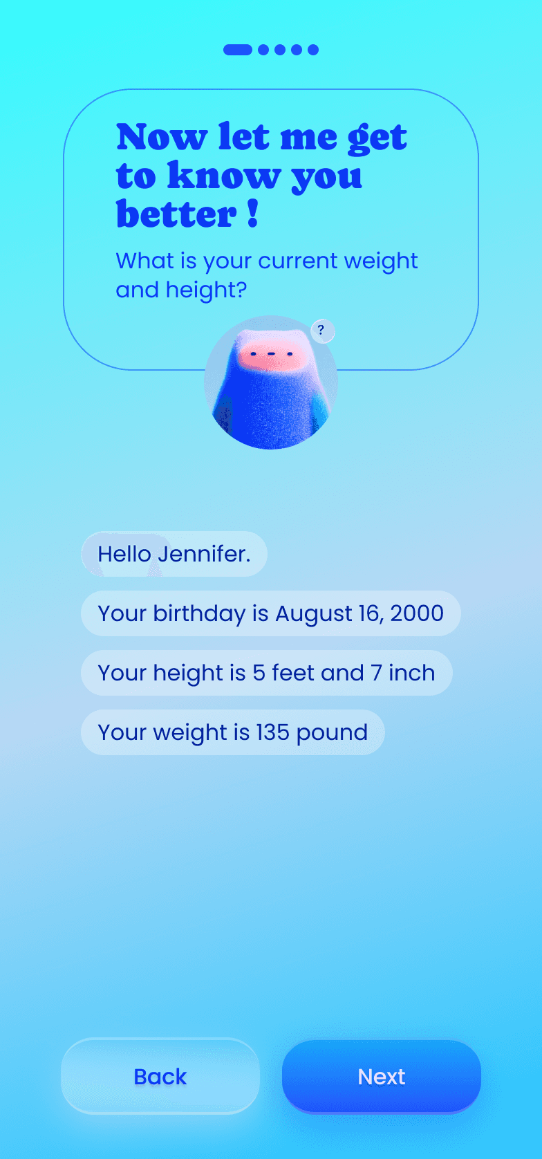 Design a streamlined onboarding flow that balances three critical needs: capturing essential user data for personalization, communicating Luna's AI-powered value proposition clearly, and maintaining user engagement throughout the process. The solution needed to feel conversational and friendly—aligned with Luna's approachable personality—while efficiently moving users toward their "aha moment."