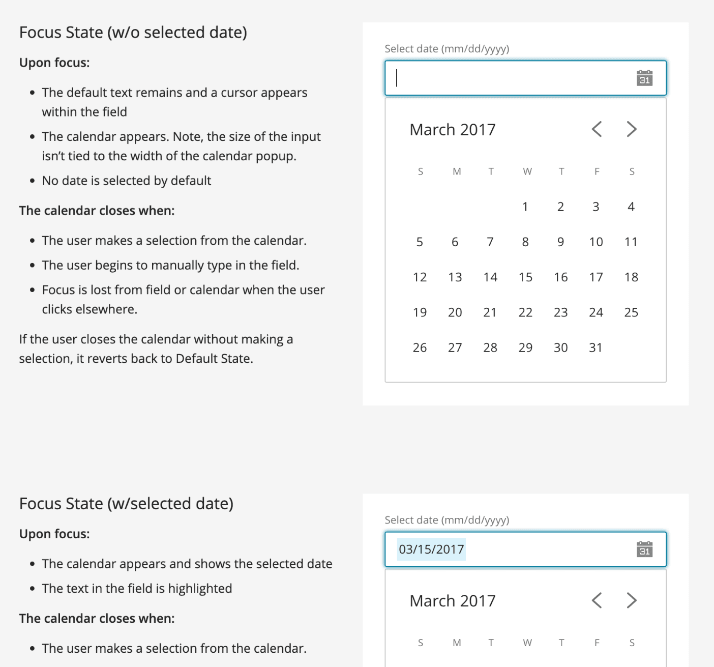 There’s a specific area to address how component displayed accessibility elements ( focus state ). and how the key stroke navigated across component.