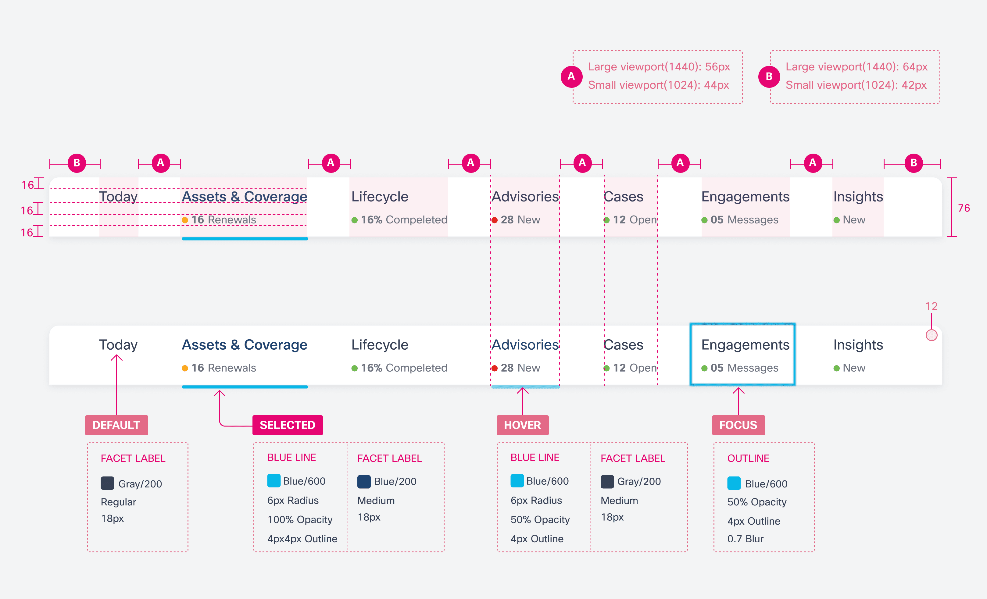 Specification and redline of the component. Include color, font, sizing and responsive in breakpoints